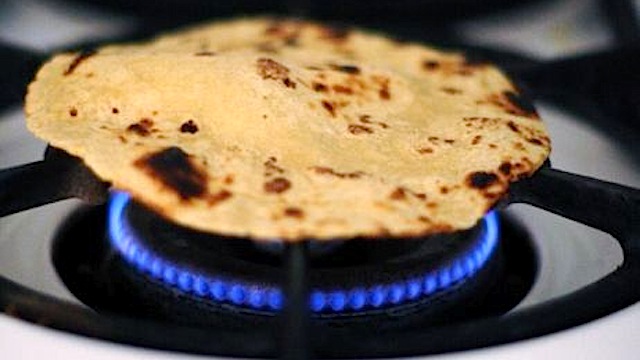 Gebruik de laagste stand van de gasbrander en leg de tortilla erop. Draai de tortilla na enkele minuten met behulp van een tang, zodra de tortilla begint te verkleuren.