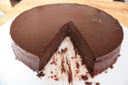 Klop de roomkaas glad en klop er de suiker en de custardpoeder door. Klop er een voor een de hele eieren en dan de dooiers door, vervolgens de zure room en ten slotte de met heet water aangemaakte cacao en de gesmolten chocolade. Klop tot je een glad beslag hebt. Haal de springvorm uit de virezer en bekleed de buitenkant van de vorm met een flinke laag plasticfolie en daaroverheen een laag dik aluminiumfolie. Dit beschermt de taart tegen het waterbad.