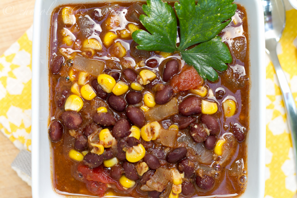 In een grote soeppan bak je de uien in de olijfolie tot ze zacht zijn. Roer de chilipoeder, knoflookpoeder, komijn, zout en peper er doorheen. Roer de zwarte bonen en tomaten erbij. Breng aan de kook en laat twee minuten doorkoken.