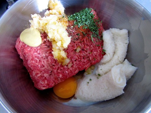 - Doe de gesnipperde ui met de rest van de ingrediënten (op de bloem en de paneermeel na) in een kom en kneed tot er geen witbrood meer te zien is.