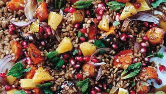 Arabische speltsalade met wortel, munt, granaatappel en sinaasappel