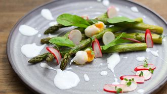 Geroosterde asperges met gemarineerde voorjaarsgroenten en citroen-geitenyoghurt