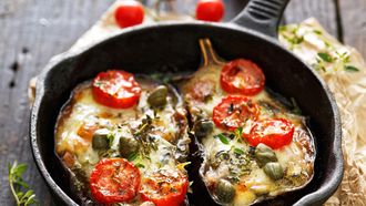Geroosterde aubergine met mozzarella, cherrytomaatjes en kappertjes