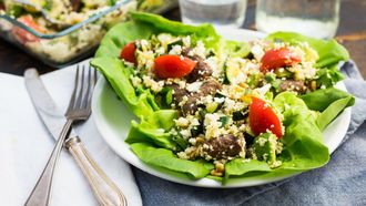 Kruidige couscoussalade met worstjes, avocado en feta