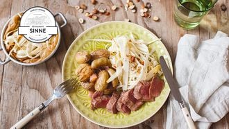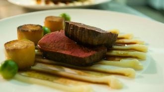 Lamsfilet met witte asperge-hazelnootsalade en gepofte aardappeltjes