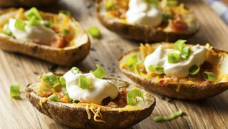 Potato skins met cheddar, zure room en bacon