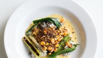 Auberginepuree met maïs en beurre blanc van Scheepskameel
