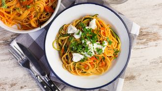 Romige pasta met geroosterde paprikasaus en geitenkaas