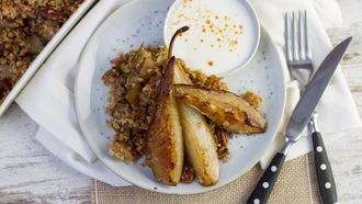 Appel crumble met peer en yoghurtsaus