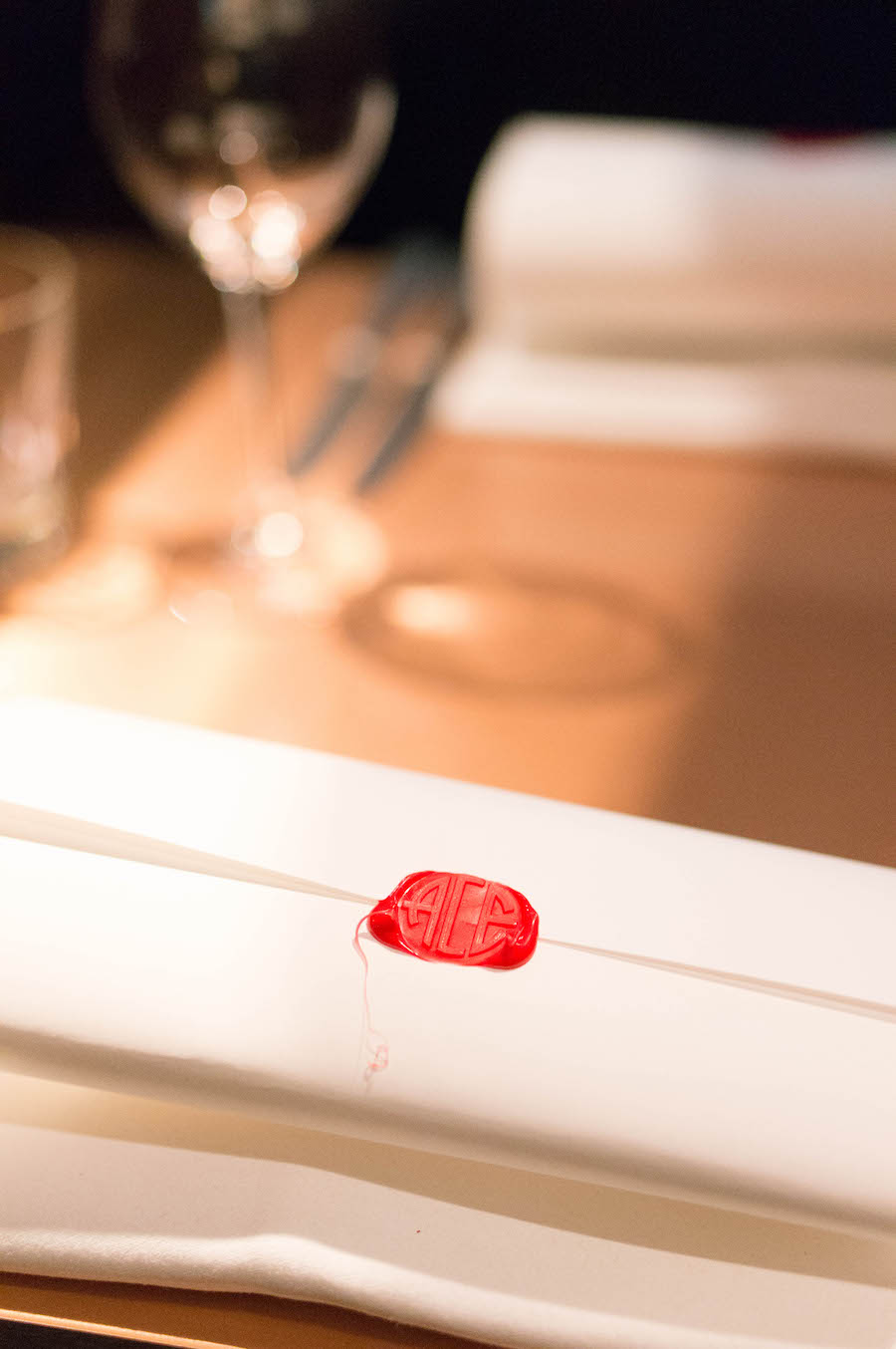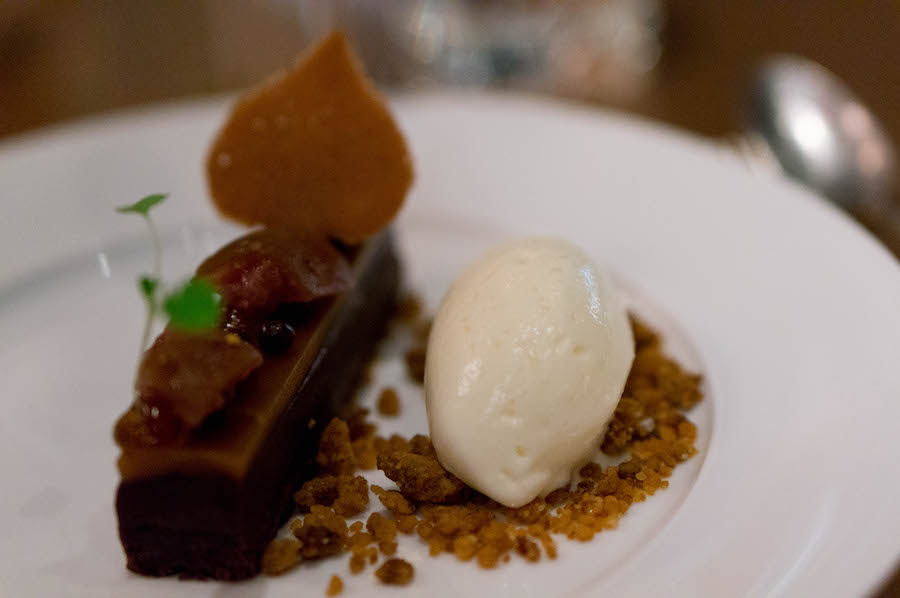 De bediening geeft ons wat ruimte – wat fijn is na vijf gangen – tot de laatste troef van de chef: het nagerecht! Gelukkig hoeven we niet te vrezen voor een zwaar dessert. Deze chocoladetaart kunnen we makkelijk aan: zacht en romig als een karamel, met gepocheerde vijgen, roomijs en wat druppeltjes azijn die de volle chocoladesmaak in balans brengen. Ook leuk: het koekje in de vorm van een schoppen aas (ACE).