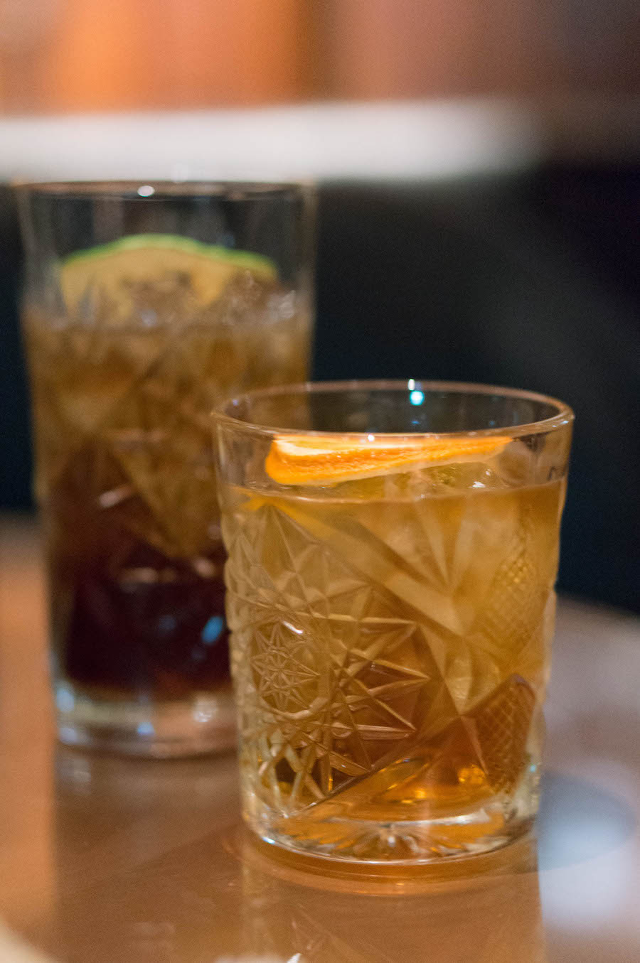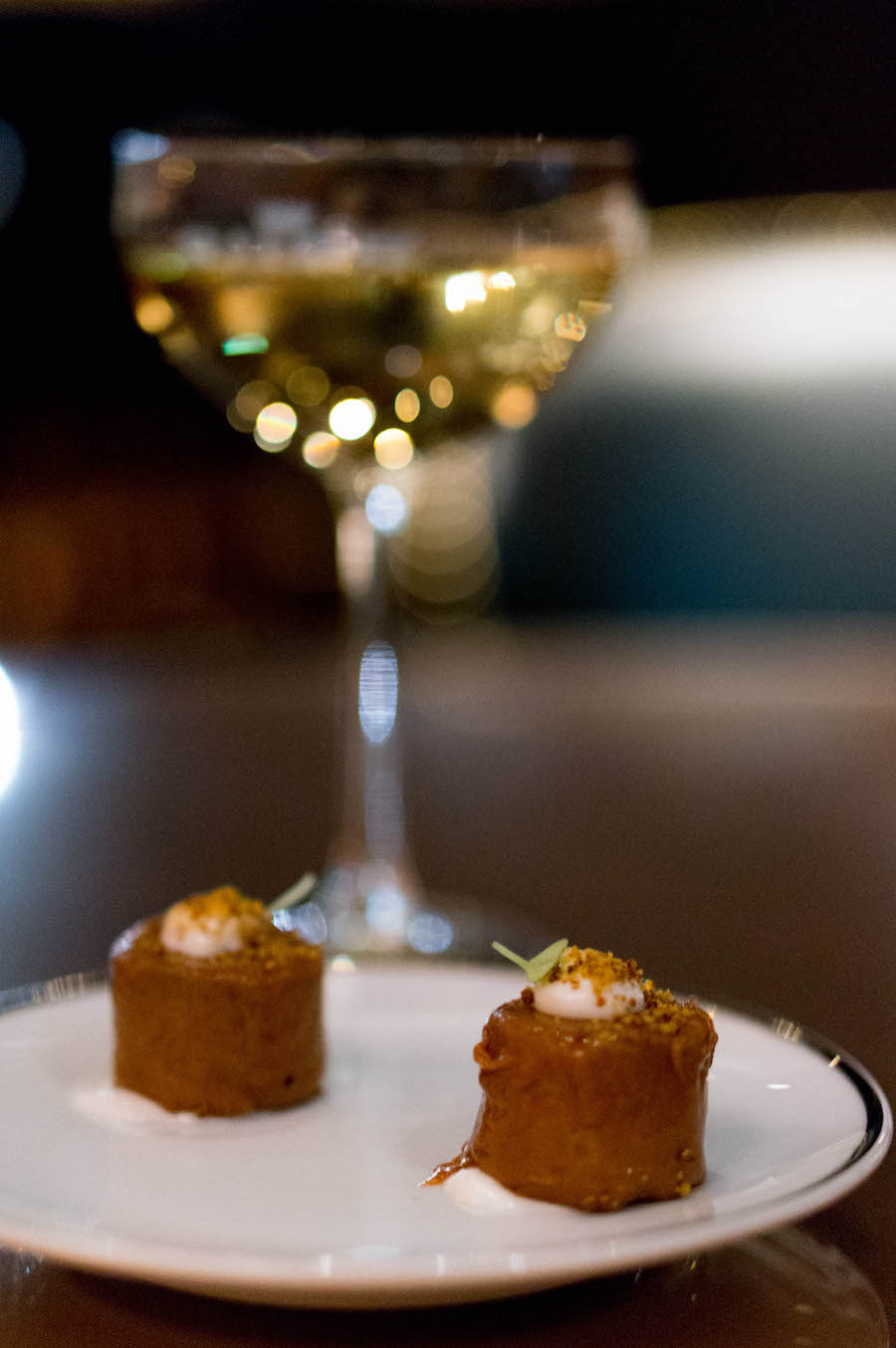 Wij gaan in ieder geval eerst voor een glaasje bubbels bij de amuse: een heerlijk hapje met jus de veau. Daarna bestellen we de Long Island ACE tea en een Old Fashioned. Beide cocktails zijn heerlijk: de long island ACE tea is gevaarlijk lekker (je drinkt ‘m namelijk zó weg) en gegarneerd met een schijfje gedroogde appel. De Old Fashioned met een schijfje gedroogde sinaasappel.