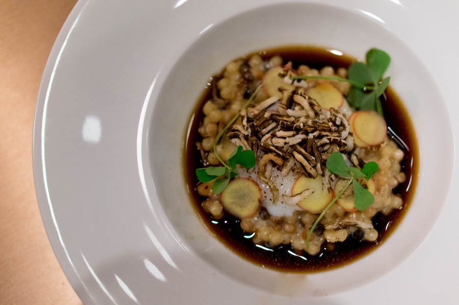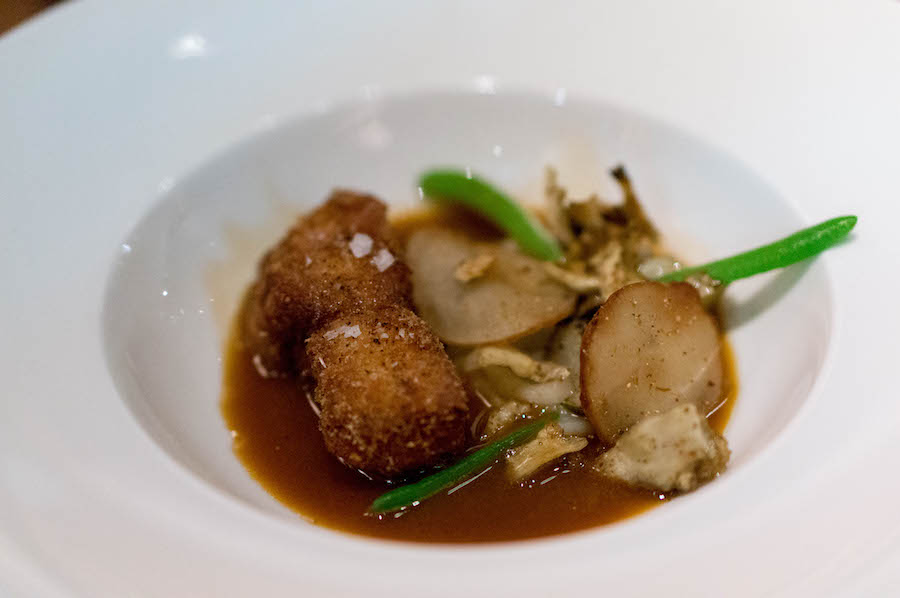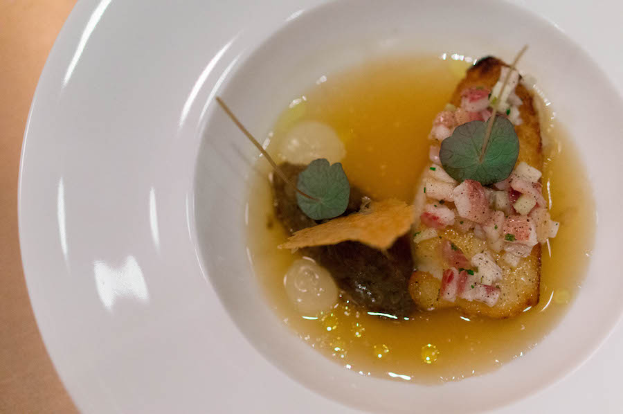 Gang drie: fregola met perfect ei (gegaard op 65 graden) en dashi van eekhoorntjesbrood. Het is moeilijk om hier niet als een gek van te gaan zitten grijnzen. Het is té lekker: het eigeel dat zich perfect vermengt met de smaakbom van een dashi, de bite van de bolletjes fregola tussendoor en dan ook nog knapperige gepofte rijst bovenop.