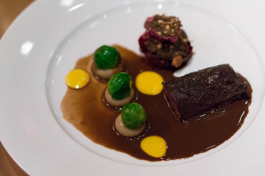 Het laatste hartige gerecht van vanavond is ook typisch Amsterdams, want de haas waarvan we het ruggetje krijgen, is in de buurt geschoten. Als je nog nooit haas hebt gegeten, is het misschien even wennen aan de stevige wildsmaak en de uitermate zachte textuur, maar het is een prachtig gerechtje. Mooi met de rodekool en spruitjes. “Een gerecht in grootmoeders stijl”, aldus de souschef.