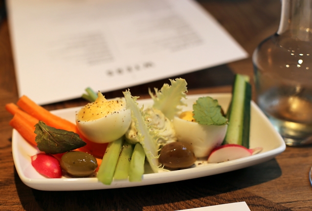 Een amuse vooraf: klassieke Hollands gevulde eitjes met crudités en een blauwe kaasdip.
