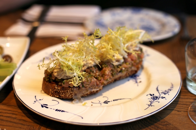 Veal tartare tonnato (€ 16,-), wat uiteindelijk een steak tartare van kalfsvlees bleek, op een flinterdun plakje lardo, op gegrild brood. Bijzonder smakelijk.