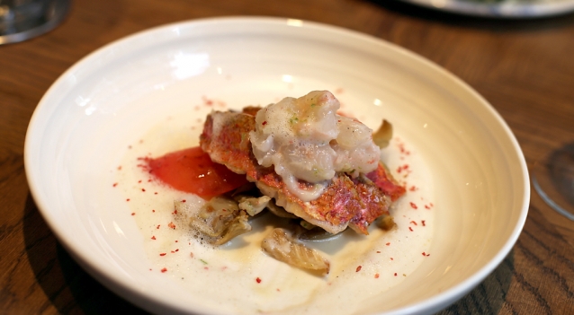 Niet van de grill, wel uit de koekenpan: rode mul met een langoustine tartaar (LEKKER!), tomaten en venkel, en een wonderschoon schuim van kaffir lime (€ 28,-).