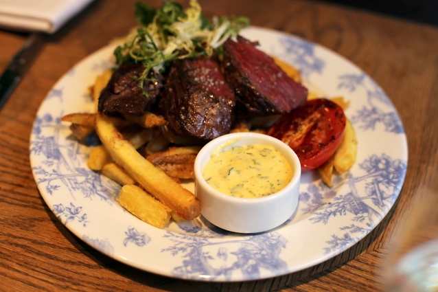 De parel van de avond: hanger steak (longhaas) van de grill, met friet en béarnaisesaus (€ 27,-). Het vlees is perfect gegaard en heeft bijzonder veel smaak, want dit type vlees (afkomstig uit de middenrifspier van het rund) is – mits het lang genoeg heeft gerijpt – heerlijk mals, sappig en smaakvol. En dat is -ie.
