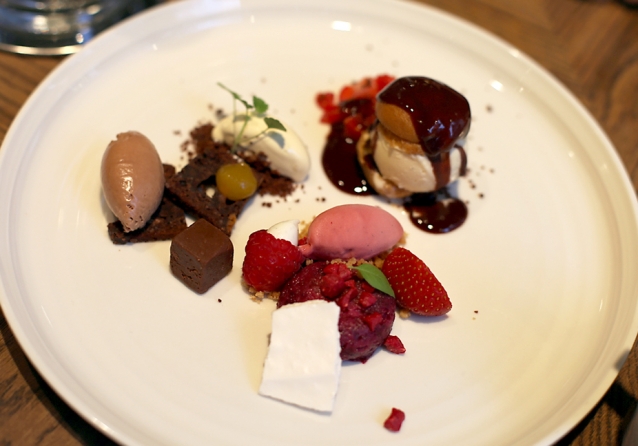 Als dessert schotelt de chef ons een proeverij van allerlei toetjes voor: brownie met chocolademousse, fuit pudding met frambozensorbet en soesjes met vanille-ijs en aardbeien. Een feestje!