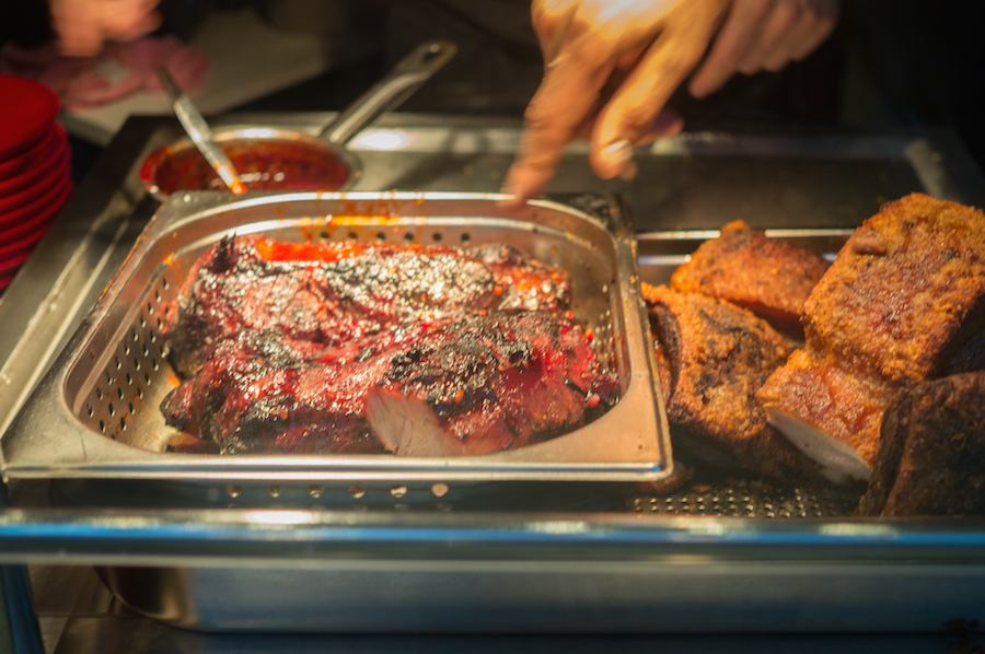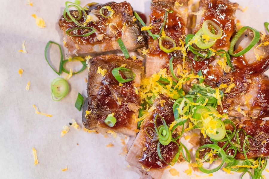 Bij Shanghai Bistro wordt het buikspek met een hamer met spijkers bewerkt. Het vet gaat daardoor naar één kant van het vlees en dat levert supersappig, zacht buikspek op dat toch ook stevig is. En met zo’n lekker krokant korstje. Ook de saus die we erbij krijgen is top en de zest van citroen en limoen snijdt er mooi doorheen en maakt het fris.