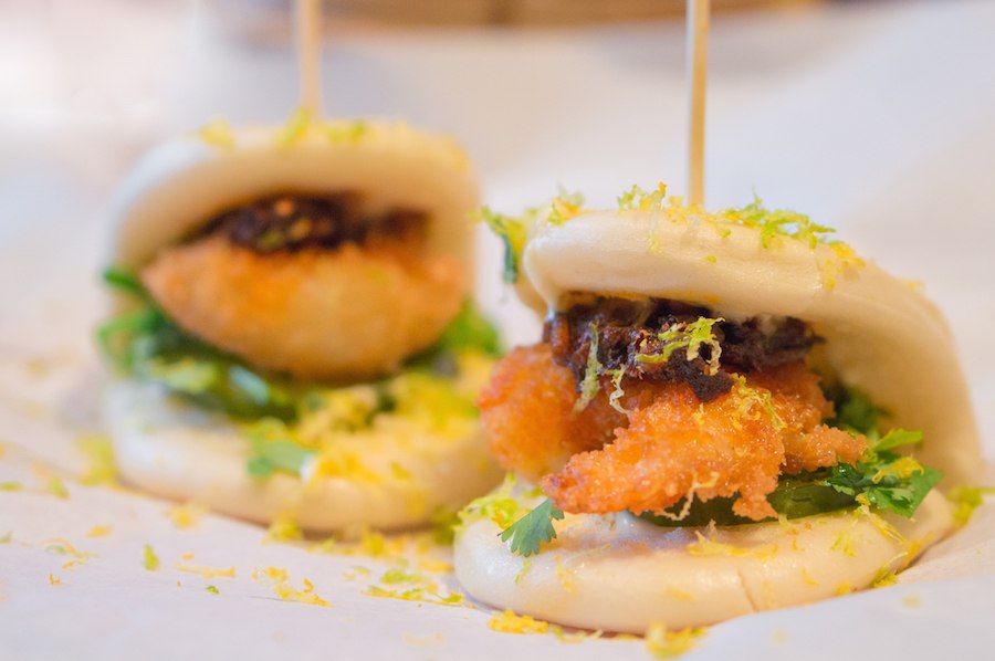 Een verse zelfgemaakte steamed bun, zacht en licht, sappige, vlezige garnaal in een krokant korstje, fantastische huisgemaakte xo saus, frisse limoenmayonaise en een pickle van komkommer die is ingelegd in sushi-azijn. Wow.
