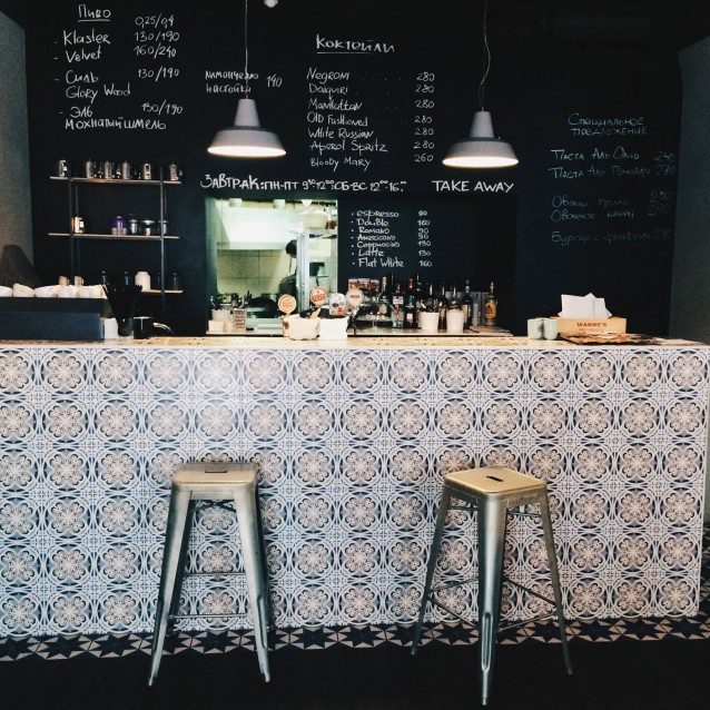 In het café eet je traditionele Russische heerlijkheden. Je voelt ‘m al aankomen: blini’s met zalmkaviaar of met spinazie en huisgemaakte augurkjes. Maar ook burgers, gebakken aardappeltjes en gebakken coquilles zijn een optie. Uiteraard met een shotje wodka – of twee.