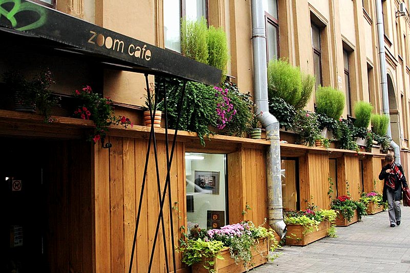 Ontbijten is hier een feestje (bestel de Oladyi, kleine dikke pannenkoekjes, geserveerd met zure room of gecondenseerde melk). Maar ook lunchen en dineren is fijn bij Zoom; kies de salade met haring – echt Russisch – of de aardappelpannenkoekjes met zalm en roomkaas.