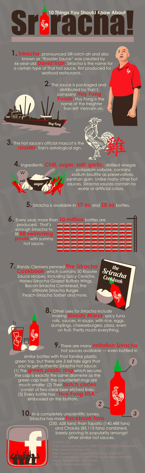 De hete Sriracha-saus is helemaal hot. Meer weten over deze saus? De fijne site Dailyinfographic.com verzamelde 10 leuke weetjes.