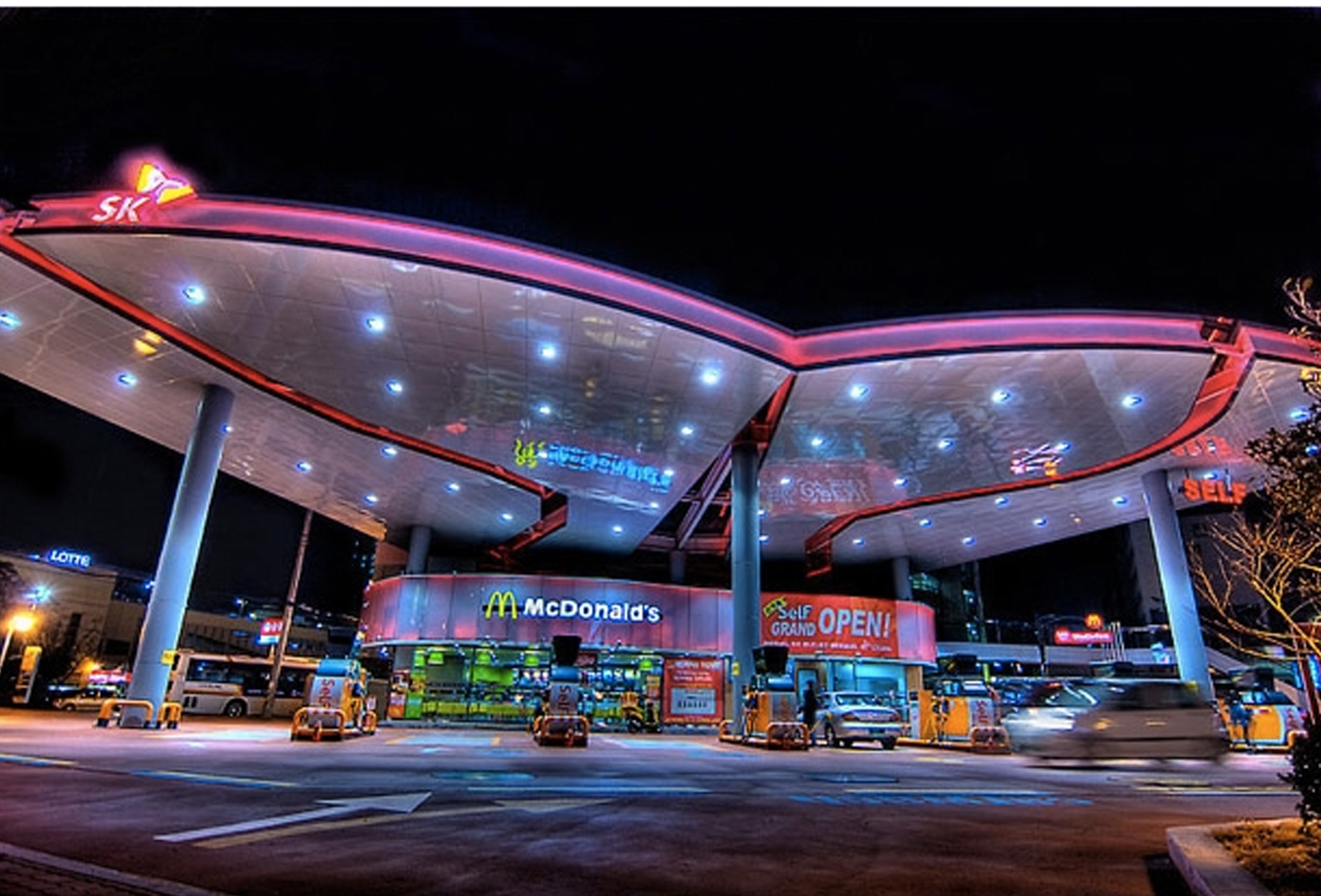 Deze relatief kleine McDrive in Ulsan, Zuid-Korea is bijzonder door de gekke vleugels en bizarre kleuren.