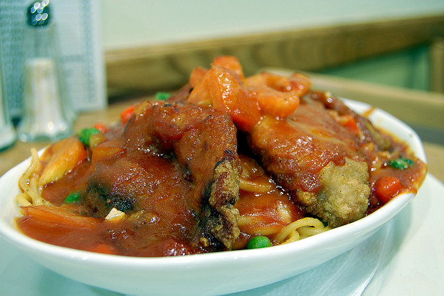 Ingewreven karbonaadjes met knoflook, gestoofd in een rode saus. De saus wordt gemaakt met tomaat, paprika, piccalilly en veel kruiden.