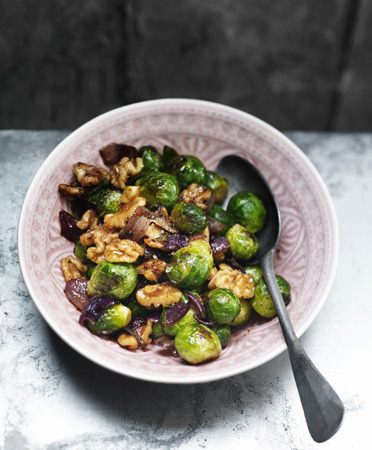 Wel zin in spruitjes maar geen idee wat je ermee moet doen – naast koken? Wok ze met wat rode ui en walnootjes.
