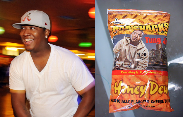 Waarom rapper Yung Joc zijn gezicht leent aan deze ‘Honey Dew Cheese Curls’? Wij hebben geen flauw idee.