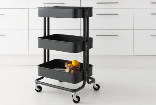 Geen plek of geld voor een enorm keukeneiland? Koop dan een verrijdbaar kleiner ‘eiland’, ook wel een roltafel genoemd. Ideaal om spullen in op te bergen, en zo creëer je direct extra werkoppervlak.