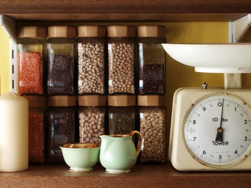 Koop mooie, schone glazen opbergpotten voor je voorraadkast; als je open planken hebt, kun je deze meteen mooi showen. Blokker, Action en IKEA hebben hele voordelige exemplaren; ook op Marktplaats kom je regelmatig een collectie tegen voor weinig geld.