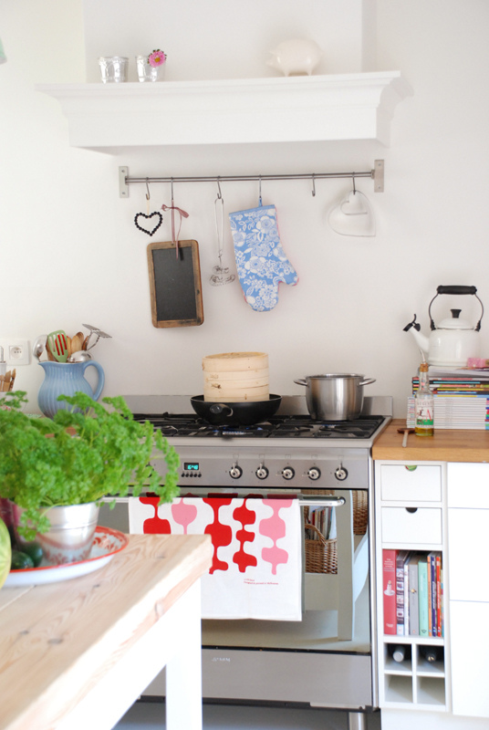 Koop vrolijke theedoeken, handdoeken en ovenwanten (bij elkaar matchend of juist niet) en hang deze op opvallende plekken in je keuken, zoals bij je ovendeur.