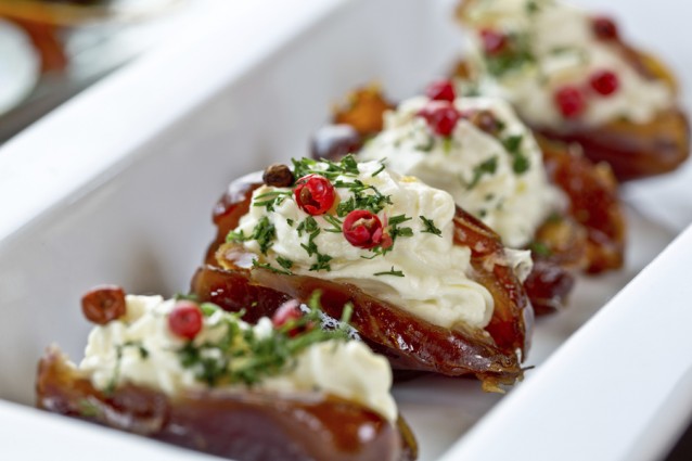 Een andere klassieker is gevuld met mascarpone en walnoten. Ontpit de dadels en vul met een lepeltje van de roomkaas (gewone roomkaas of crème fraîche kan ook). Top met een walnoot of stukjes pistache en geniet!