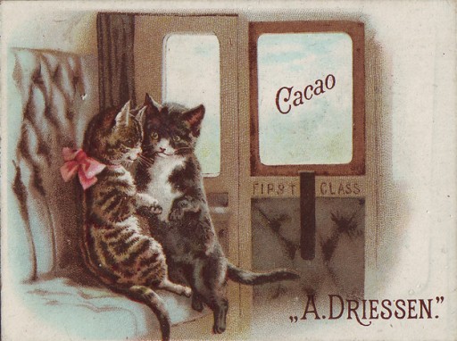 Er zitten zelfs twee mooie exemplaren bij van A. Driessen, de chocoladefabriek die zich in 1820 vestigde in Rotterdam. Rond 1893 was Driessen een van de belangrijkste chocoladebedrijven van ons land. Helaas overleefde het bedrijf de beurskrach van 1929 en de daaropvolgende Grote Depressie niet. De zaak werd overgenomen door de Bredase chocoladefabriek Kwatta. Na meer dan een eeuw kwam er een einde aan het eens zo fameuze bedrijf. Dat merk is sinds 2001 in handen van Heinz.