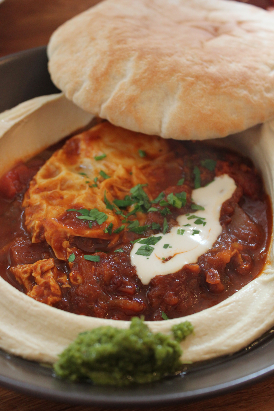 Toen ik voor het eerst over Reggev Hummus hoorde was ik wel een beetje verbaasd, een plek waar ze alleen maar hummus serveren? Dat kan toch niet? Maar ze pakken het heel origineel aan: je kiest hummus gecombineerd met iets anders. Ze hebben zowel vlees- als vegetarische gerechten. Zo kan je bijvoorbeeld hummus met gekruid gehakt kiezen, of hummus met ei of hummus met aubergine en ei. Dat laatste koos ik. Alle gerechten worden geserveerd met salade van ingemaakte groenten en olijven en heerlijke grote pita’s. In de tent hangt een hele gezellige sfeer.
