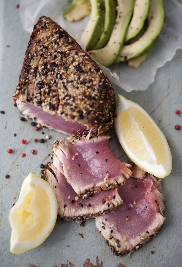 Eén van onze favoriete manieren om tonijn te bereiden is in een sesamkorst op de grill of barbecue. Koop hiervoor een groot stuk tonijn, wrijf in met een beetje olijfolie en rol door een mengsel van sesamzaadjes (het liefst witte en zwarte), zout en peper. Voeg voor extra smaak eventueel wasabipoeder, chili flakes of geraspte gember toe.