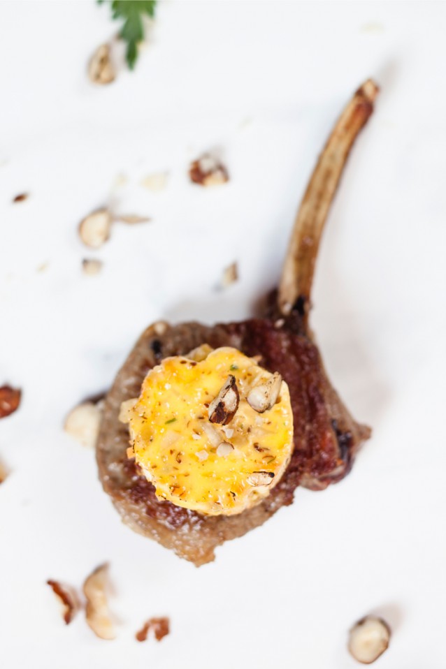 2. Maak een boter met je favoriete kruiden en andere smaakmakers. Zoals deze variant met citroenzest en hazelnoten. Maak er een rol van en leg in de koelkast. Serveer daarna gebakken lamskoteletjes met een schijfje boter.