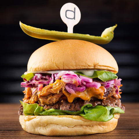 Shack rundvlees, op de barbecue gegaarde pulled pork, jalapeño-mayonaise, sla en mosterd-azijn dressing.