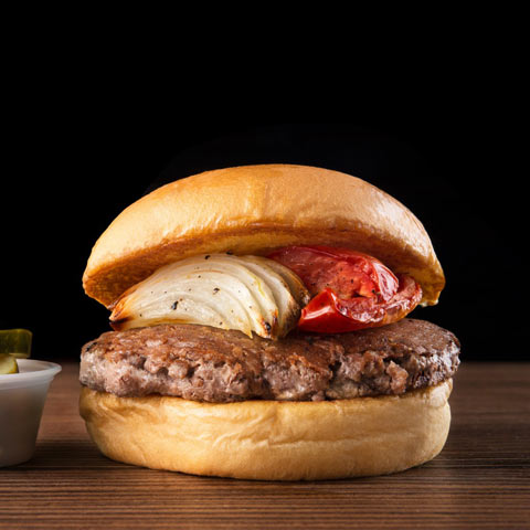 Een hamburger van geitenvlees met kruidenboter, gegarneerd met geroosterde tomaat, gegrilde ui van de barbecue en zoete augurk.