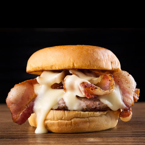 Een hamburger van rundvlees van The Breslin, aangevuld met gerookt spek, overgoten met Engelse cheddar-kaassaus.