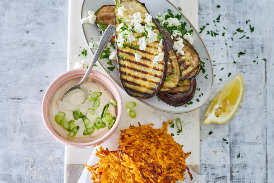 Maak bijvoorbeeld deze latkes van Culy’s Monique met een heerlijk sausje van tahin en een salade van gegrilde aubergine en feta.