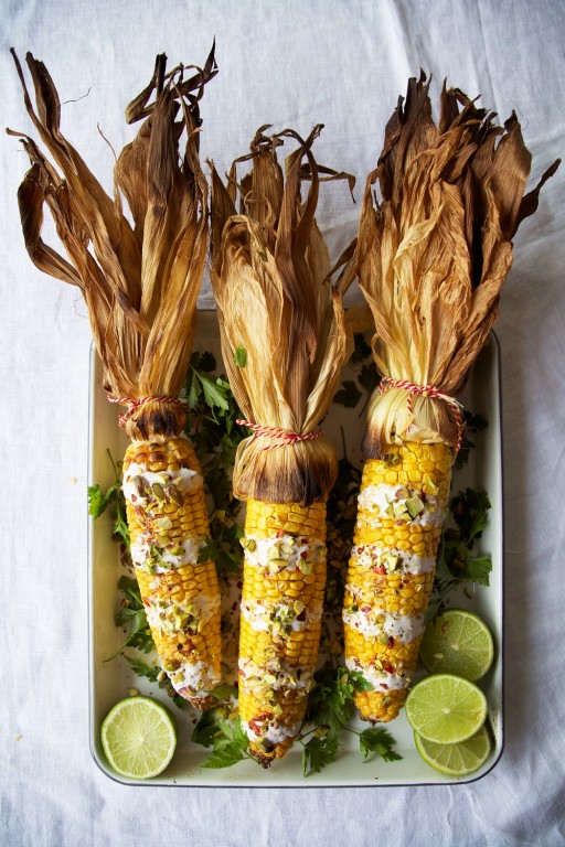 Heerlijk voor tijdens een feestje: geroosterde maïs op Mexicaanse wijze. Klik hier voor het recept.