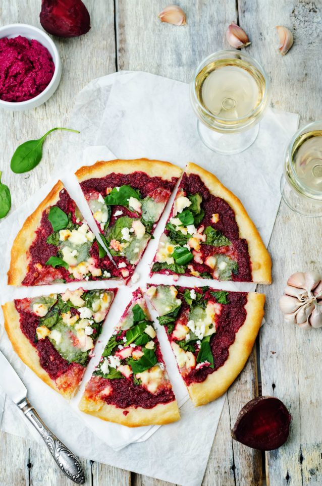 Een bekende combinatie die je ook makkelijk kunt vertalen naar een pizza! Fruit een gesnipperd uitje met een teentje knoflook, en maal in een keukenmachine een paar gekookte bietjes fijn. Roer de gefruite en knoflook door de bietenpuree en breng op smaak met peper en zout.