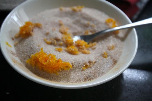 Rasp de schil van een biologische sinaasappel en meng hiervan een kwart met 200 gram fijne, witte suiker. Voeg eventueel een stuk of vijf kruidnagels en een half, opengesneden vanillestokje toe. Bewaar in een luchtdicht bakje.