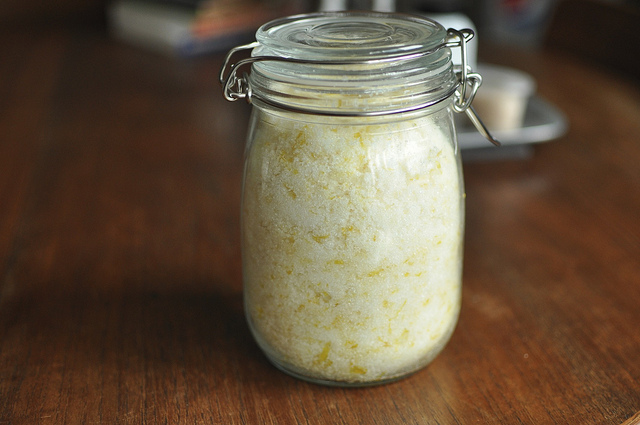 Lekker fris voor op bijvoorbeeld een stukje vis, vlees of aardappeltjes. Rasp hiervoor de schil van een halve citroen en snijd fijn. Droog de rasp in een op 100 graden voorverwarmde oven gedurende drie kwartier en laat afkoelen. Meng met 250 gram zout, laat minstens een dag trekken en bewaar luchtdicht.