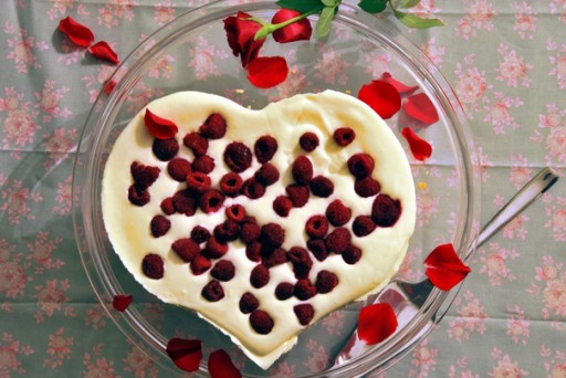 Sluit tot slot de avond af met een romantische taart. Wat dacht je van deze variant met witte chocolade en frambozen van My Food Blog?