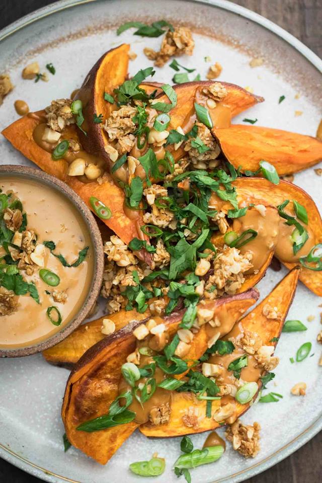 Partjes geroosterde zoete aardappel met een homemade pindasaus en knapperige pinda-granola. What’s not to love? Het recept vind je op Naturally Ella.