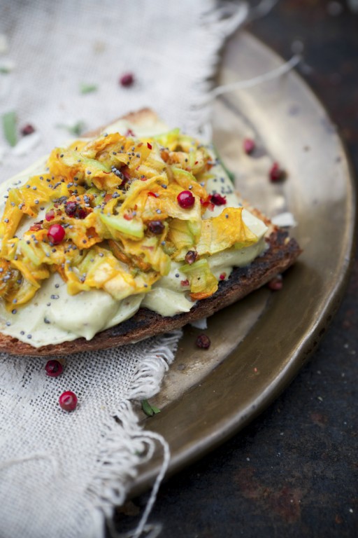Klik hier voor het recept voor raita. Kun je niet aan courgettebloemen komen? Vervang het dan door radicchio.